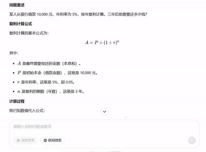 在计算利息这类更为场景化的数学题中,LongCat-Flash能给出更为全面的分析和解题过程,并最终得出正确答案。