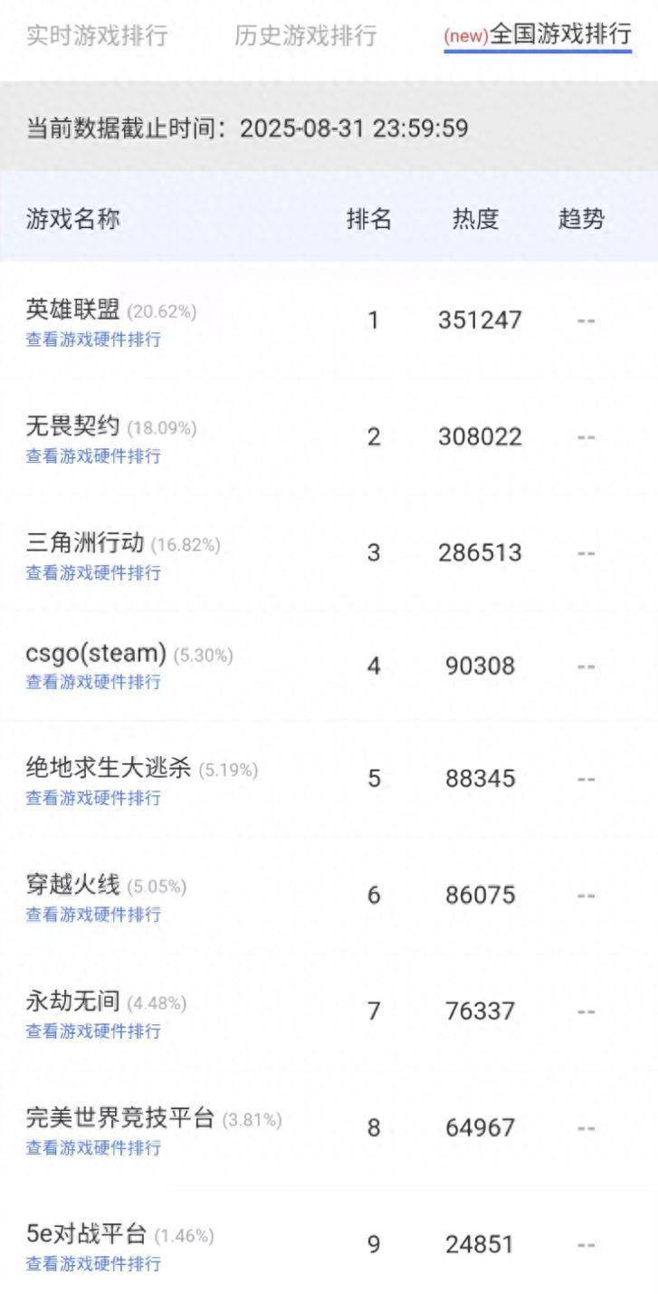 根据“精灵AI”平台提供的全国网吧实时数据统计(截至2025年8月31日),《英雄联盟》以20.62%的热度占比和超过35万的热度值稳居第一,继续巩固其在MOBA领域的统治地位。而《无畏契约》则以18.09%的热度占比、突破30万的热度值紧随其后,牢牢占据第二的位置,成为FPS品类中无可争议的领头羊。