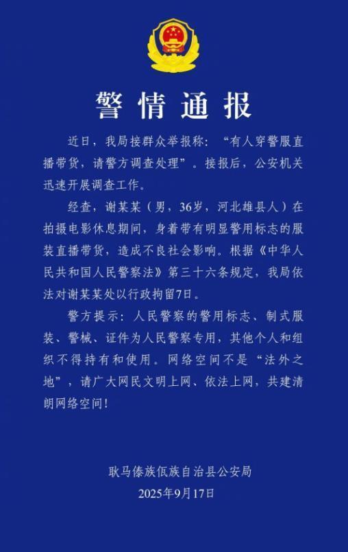 9月17日晚,云南耿马傣族佤族自治县公安局发布警情通报:近日,我局接群众举报称:“有人穿警服直播带货,请警方调查处理”。接报后,公安机关迅速开展调查工作。经查,谢某某在拍摄电影休息期间,身着带有明显警用标志的服装直播带货,造成不良社会影响。根据《中华人民共和国人民警察法》第三十六条规定,我局依法对谢某某处以行政拘留7日。(据9月17日现代快报报道)