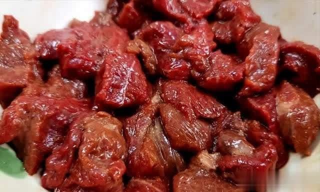 1、牛肉逆着纹理切成骰子大小的方块。这一步别偷懒,逆纹切才能嫩!切好的牛肉粒放进碗里。