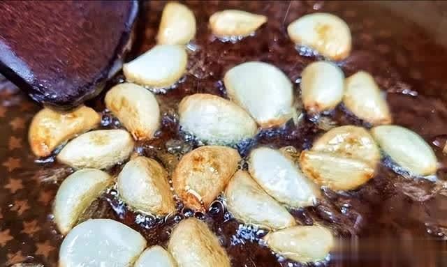 4、锅烧热倒油(比平时炒菜稍多),油温五成热(放根筷子周围冒小泡),转中小火,倒入蒜瓣,耐心点,慢慢炸,用勺子轻轻推,炸到蒜瓣表皮金黄起皱,像穿了一层薄薄的金纱衣,蒜香扑鼻时捞出控油。锅里的蒜油可别倒掉,留着炒肉,香上加香!