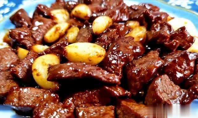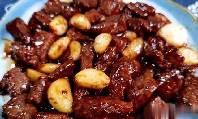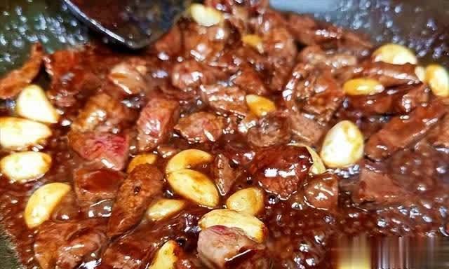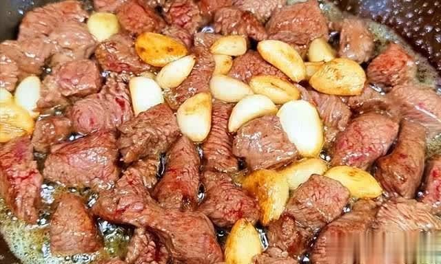 7、把滑炒好的牛肉粒和炸好的金蒜瓣,一起倒回锅里!转中大火,快速翻炒,让每粒牛肉、每颗蒜瓣都裹上那诱人的酱色!此刻,香气已掀翻屋顶!